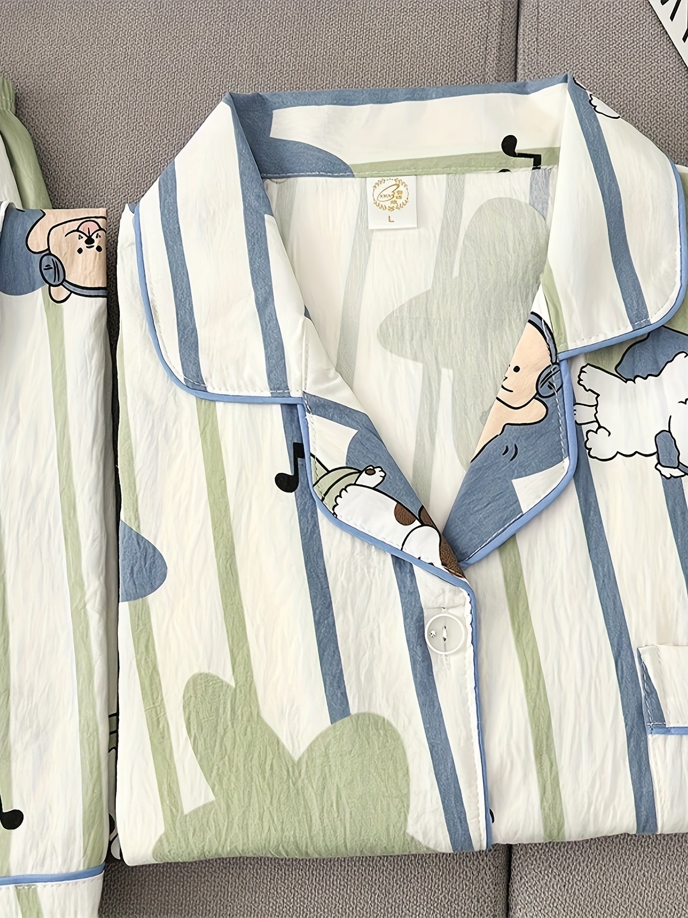 Cozy up in cuteness with this puppy print pajama set, featuring adorable dog illustrations with fun expressions and accessories. Designed with green and blue vertical stripes and playful leaf shapes, this set adds a cheerful touch to your nightwear.