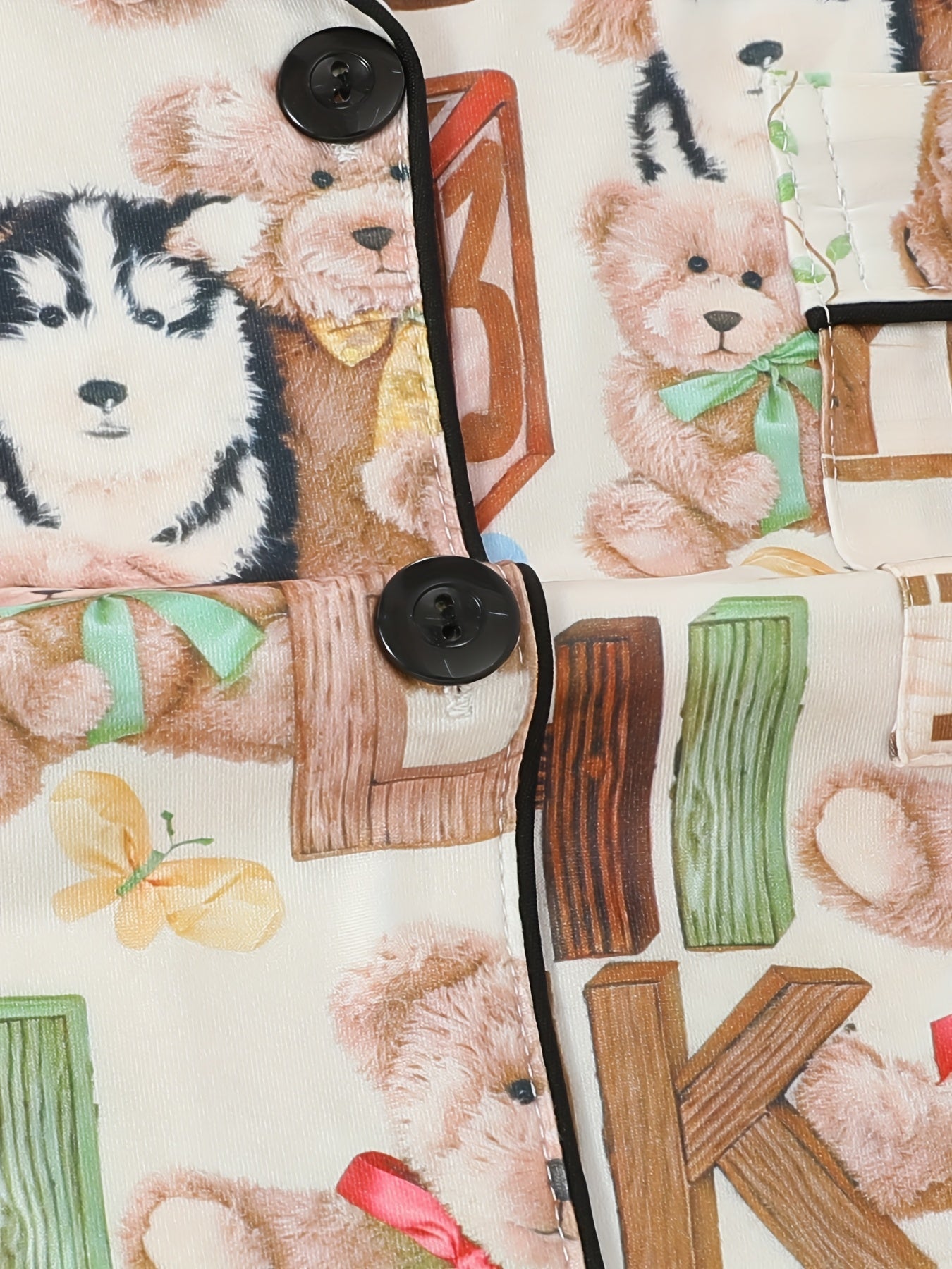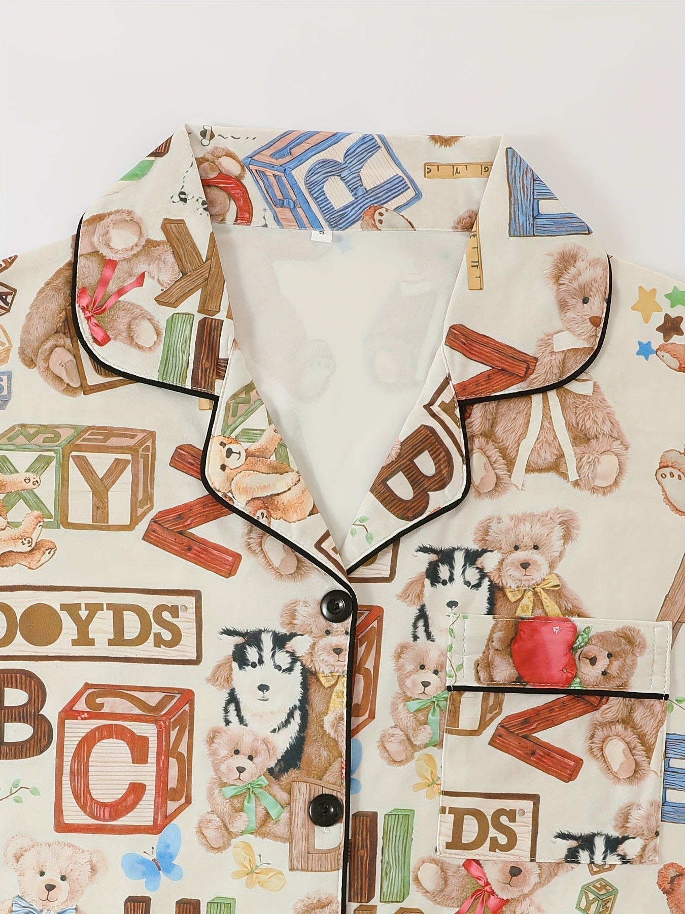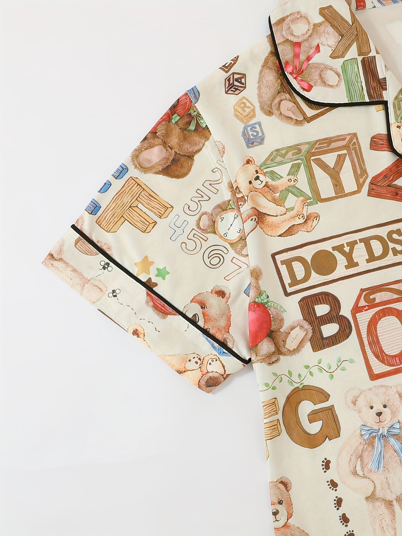 Add a playful twist to your loungewear with this alphabet & teddy bear print 3-piece nightwear set, featuring a short-sleeve button-down shirt, elastic waist shorts, and full-length pajama pants. The cream base is decorated with cute teddy bears, colorful alphabets, numbers, and toy-inspired prints, making it a cozy and nostalgic choice for bedtime.