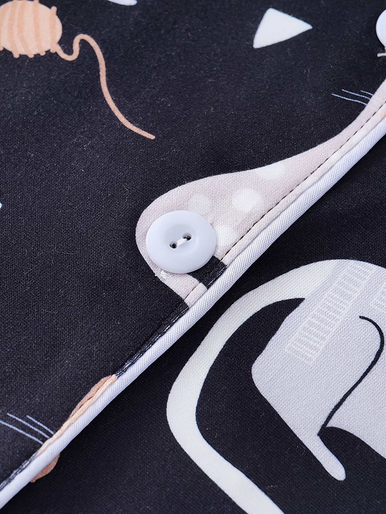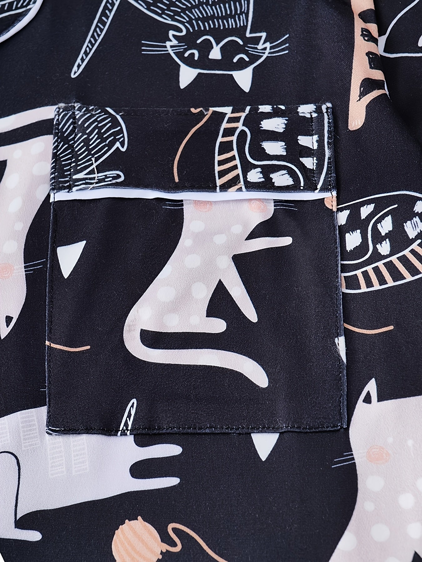 Unwind in style with this adorable 3-piece nightwear set, featuring a short-sleeve button-down shirt, elastic waist shorts, and full-length pajama pants. Designed with a playful cat and yarn ball print on a sleek black base, this set adds a touch of cuteness to your bedtime routine.